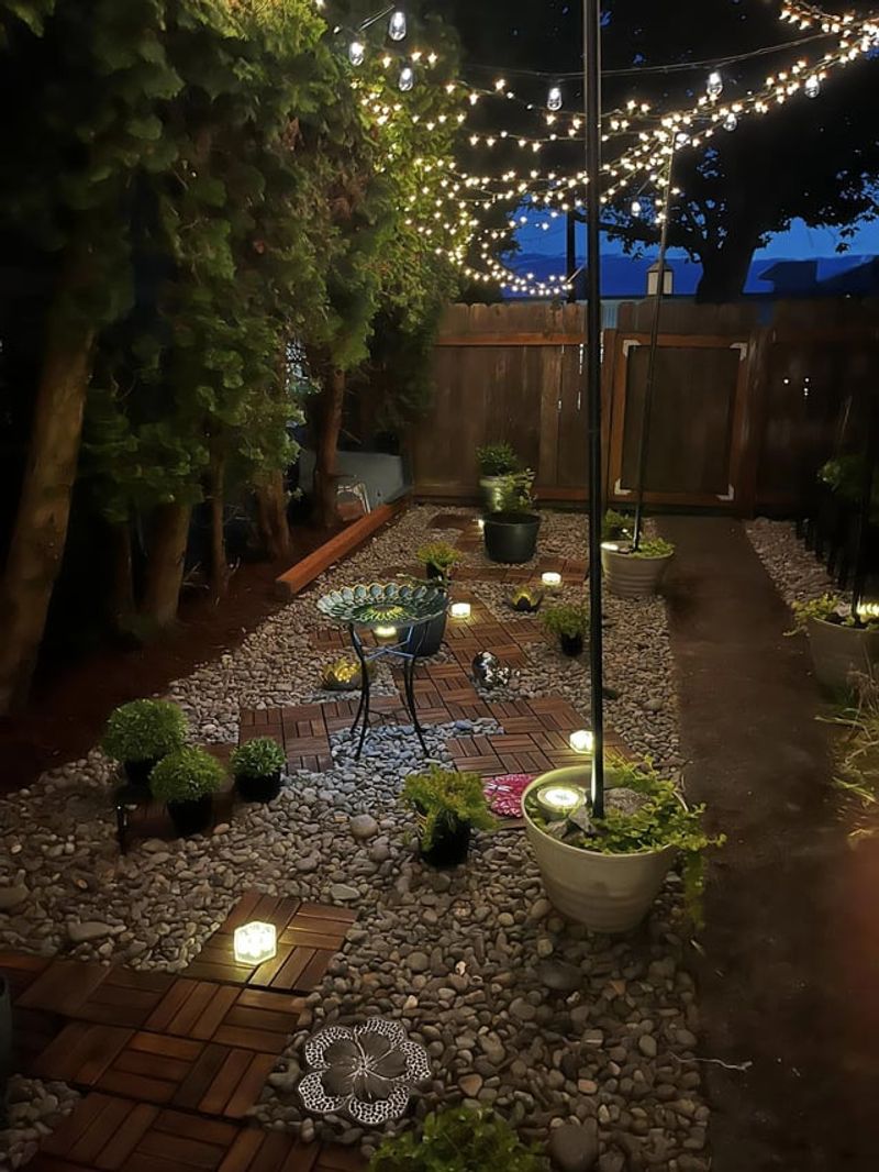 Crisscrossing weatherproof string lights overhead instantly create an outdoor room feeling without walls. The illuminated ceiling draws the eye upward, making the space feel larger and more defined.