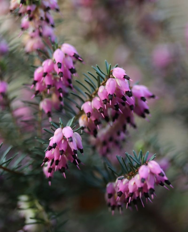 Tiny bell-shaped flowers cover these low evergreen shrubs from late fall through early spring in Pennsylvania. Winter heath (Erica carnea) creates colorful groundcover that stays attractive even when temperatures plummet below freezing.