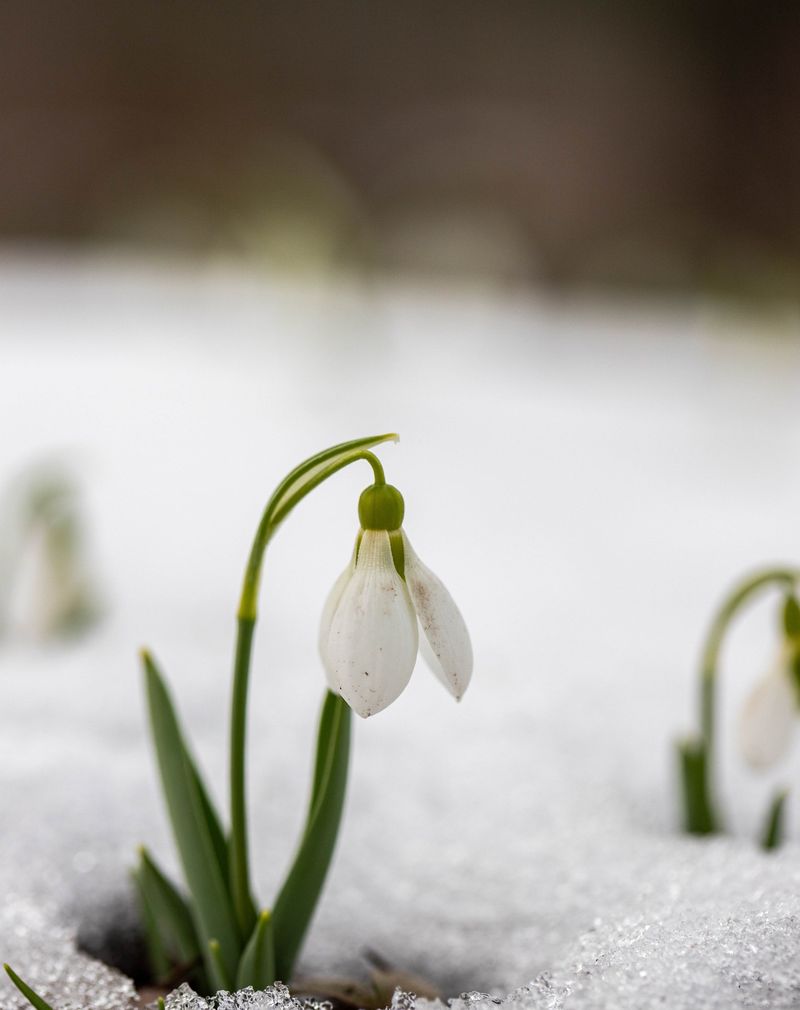 Despite looking fragile, snowdrops are surprisingly tough and can survive temperatures well below freezing without damage. Plant bulbs in fall under deciduous trees where they’ll get winter sun but summer shade, and watch them multiply into larger clumps each year naturally.