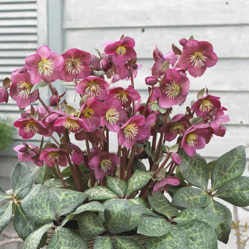 Their waxy petals come in shades of white, pink, purple, and even green, lasting for weeks without wilting. Plant them in partly shaded spots where they’ll get protection from harsh winds but still receive some winter sun for best results.