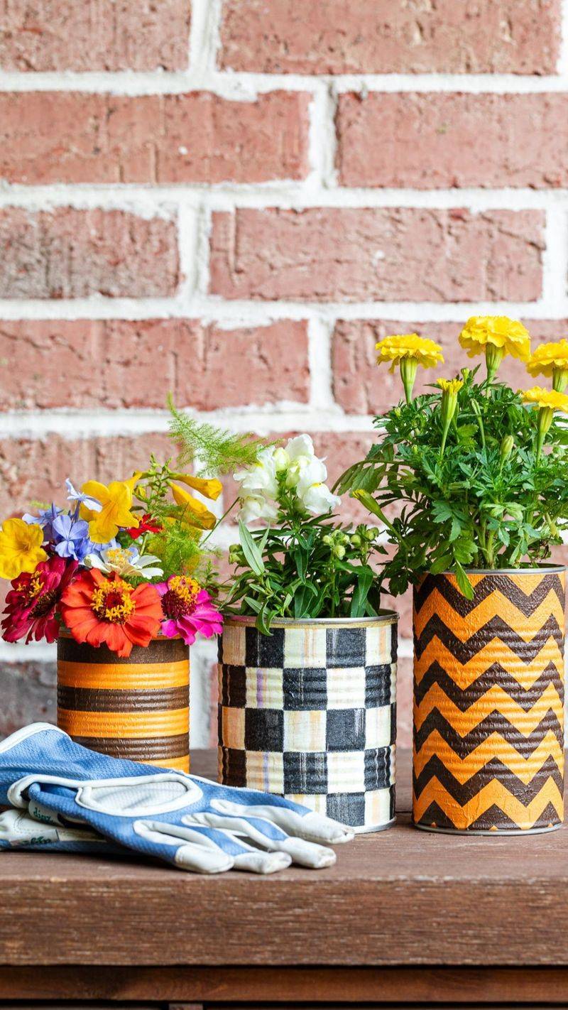 Empty paint cans, thoroughly cleaned and dried, make industrial-chic planters for indoor or outdoor use. The metal handles make them easy to move around as needed.