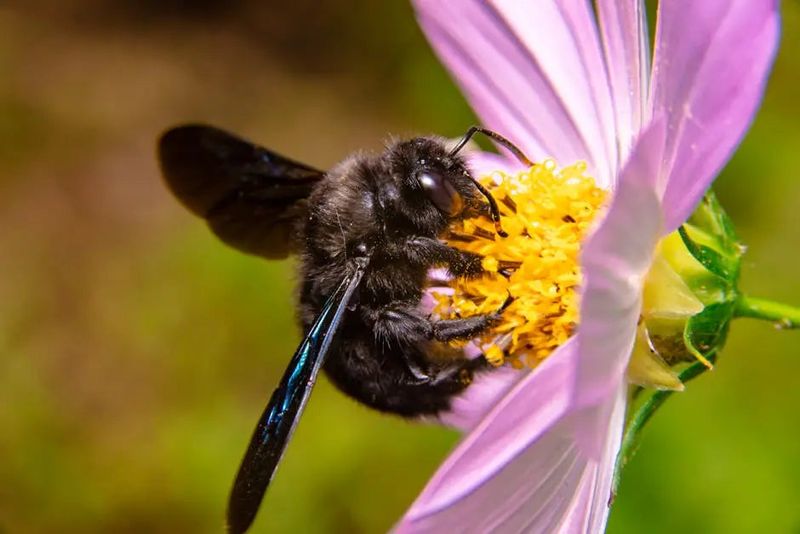 Large, shiny black bees hovering around wooden structures often cause gardeners unnecessary concern. Despite their intimidating size and helicopter-like hovering, male carpenter bees lack stingers entirely, while females rarely sting unless handled.