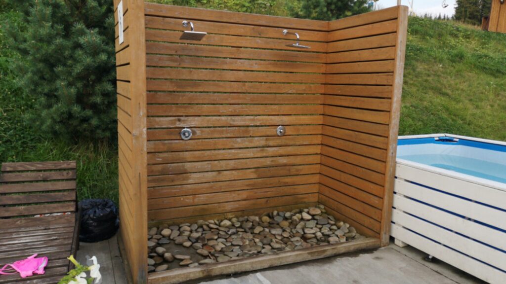 Opt for sleek fixtures and natural materials like stone or wood to blend seamlessly with your landscape, turning every rinse into a rejuvenating experience.