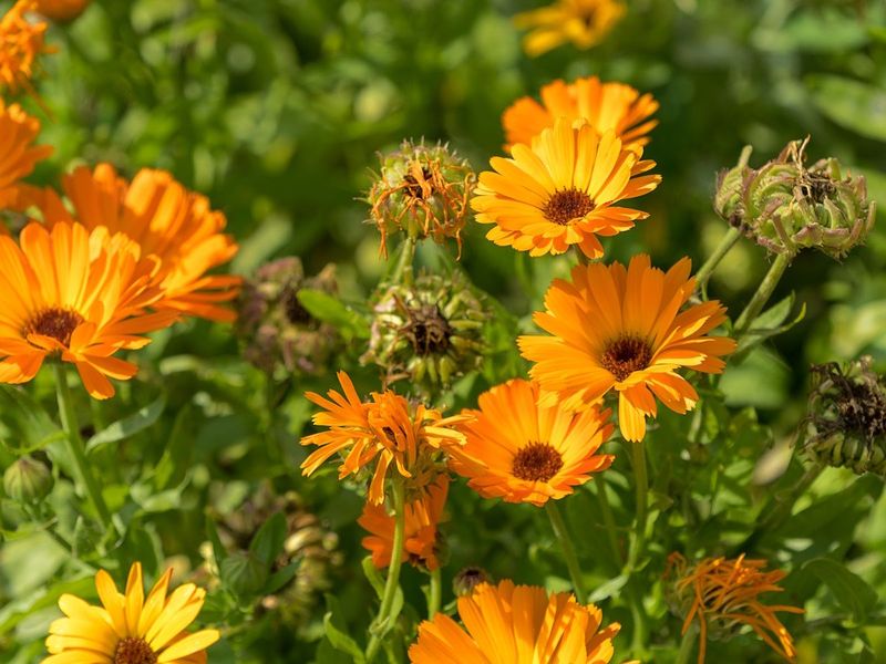 A calendula plant covered with spent blooms often shows reduced overall vigor—fewer new buds forming, smaller leaves, and a generally tired appearance. This whole-plant symptom occurs when too much energy is diverted to seed production rather than new growth.