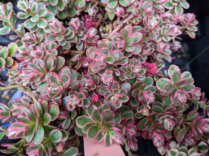 Tiny leaves in shades of green, cream, and pink create a textured carpet effect that looks especially charming spilling over the edges of containers. The colors appear randomly distributed, giving each stem a confetti-like appearance that changes with the seasons.