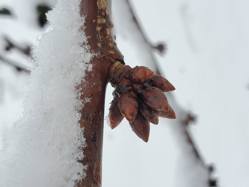After heavy snow, gently brush off branches if you can safely reach them, especially on younger trees. Focus on branches with visible bud swell.
